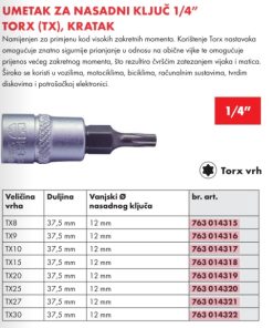 UMETAK ZA NASADNI KLJUČ 1/4” TORX (TX), KRATAK